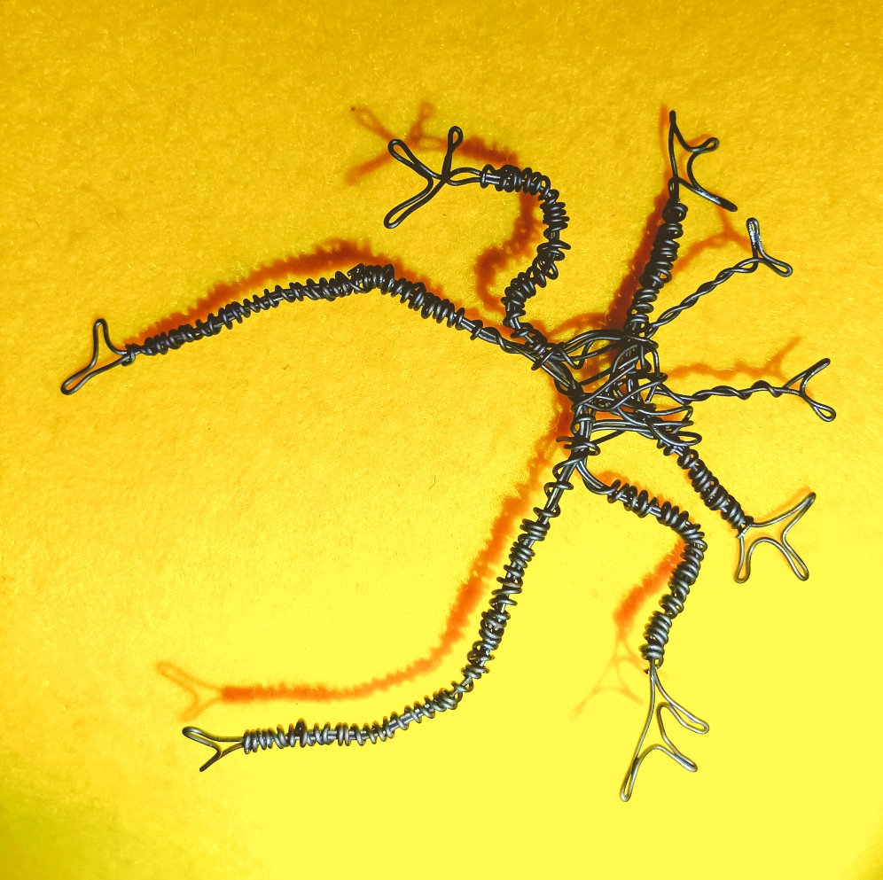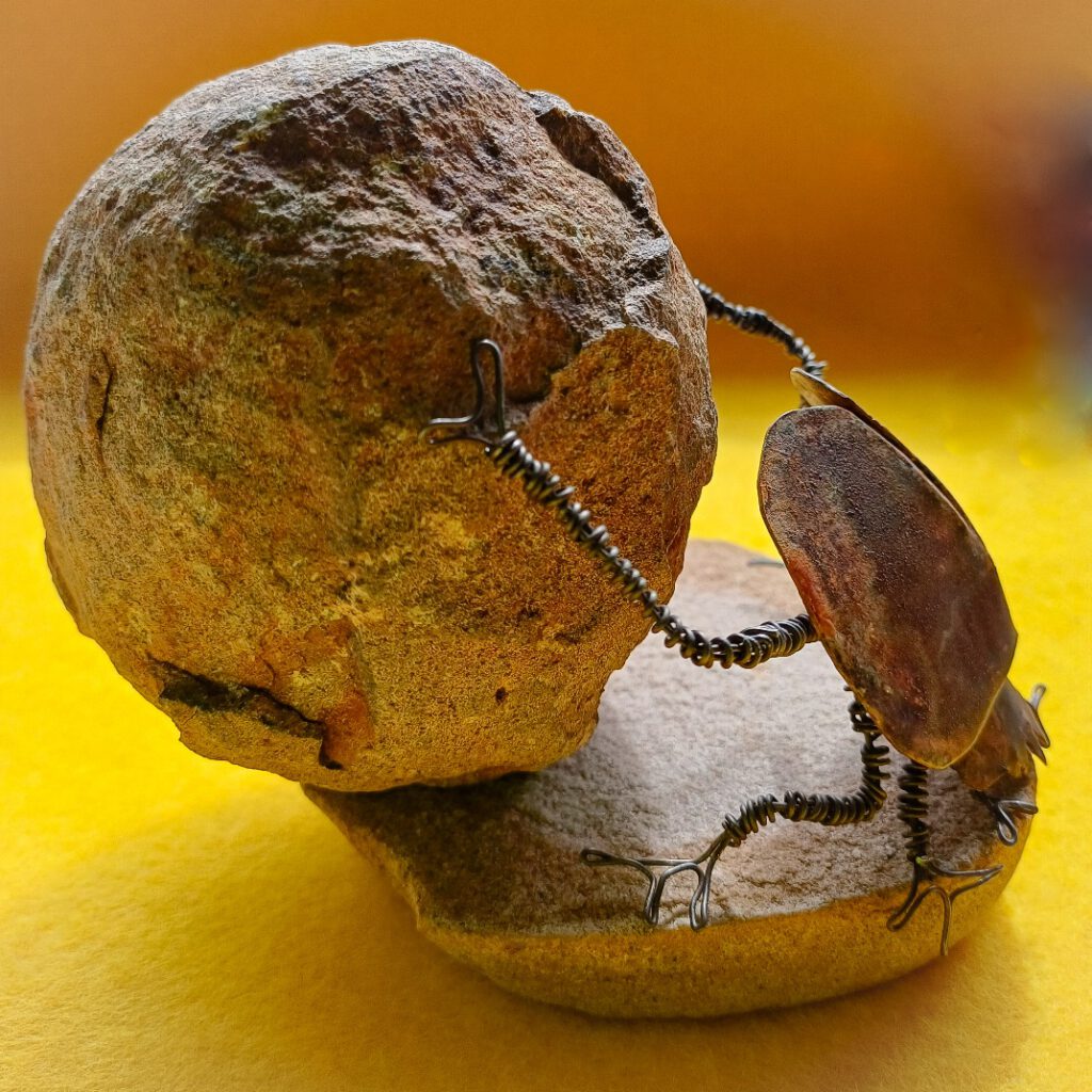 Zuhause begann ich dann mit Experimenten: welches Metall in welcher Stärke eignet sich zur Herstellung des gewünschten Käferkörpers? Aus 0,5er-Alublech und Blumendraht kam dann der unten abgebildete Entwurf zustande. Allerdings musste ich das Alublech mit Acrylfarben bemalen, um den Korrosions-Effekt zu erzeugen, weil Alu nun mal nicht braun werden will, sondern eher grau-schwarz anläuft.