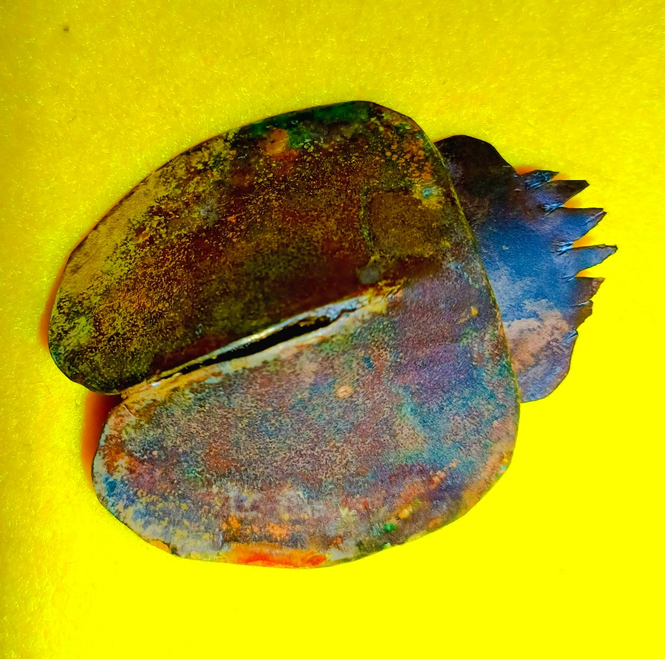Ich experimentierte weiter und kam schließlich zu dem Entschluss, den Körper aus Kupferblech zu hämmern. Online bestellte ich zwei runde Kupferplättchen mit einem Durchmesser von 60 mm und einer Stärke von 0,5 mm, schnitt die Grundform zurecht und hämmerte sie in die konvexe Form, die so ein Käferkörper nun mal hat. Auch den Brustschild mit Kopf schnitt ich aus dem Blech und bog sie rund. Nun begann der Korrosionsprozess.